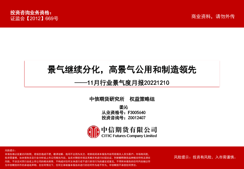 【中信期货】【20221210】11月行业景气度月报:景气继续分化,高景气公用和制造领先-57页