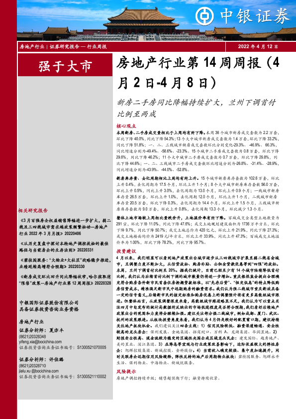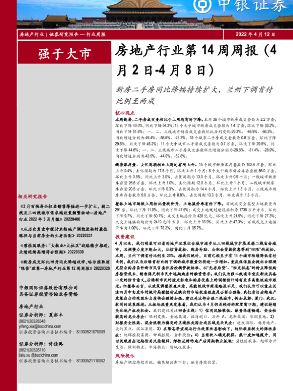 【中银证券】【20220412】房地产行业第14周周报:新房二手房同比降幅持续扩大,兰州下调首付比例至两成-25页