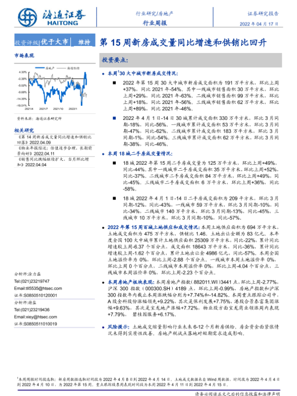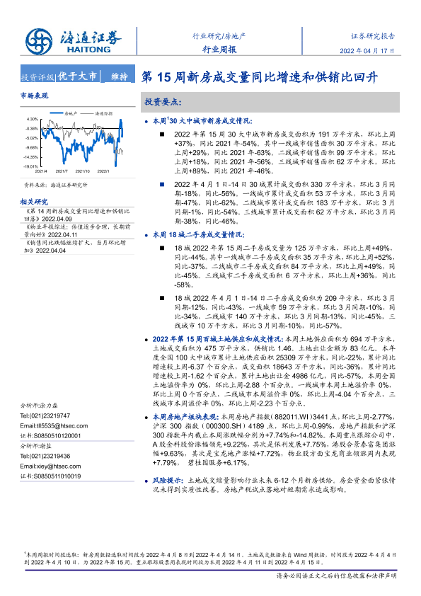 【海通证券】【20220417】第15周新房成交量同比增速和供销比回升-6页