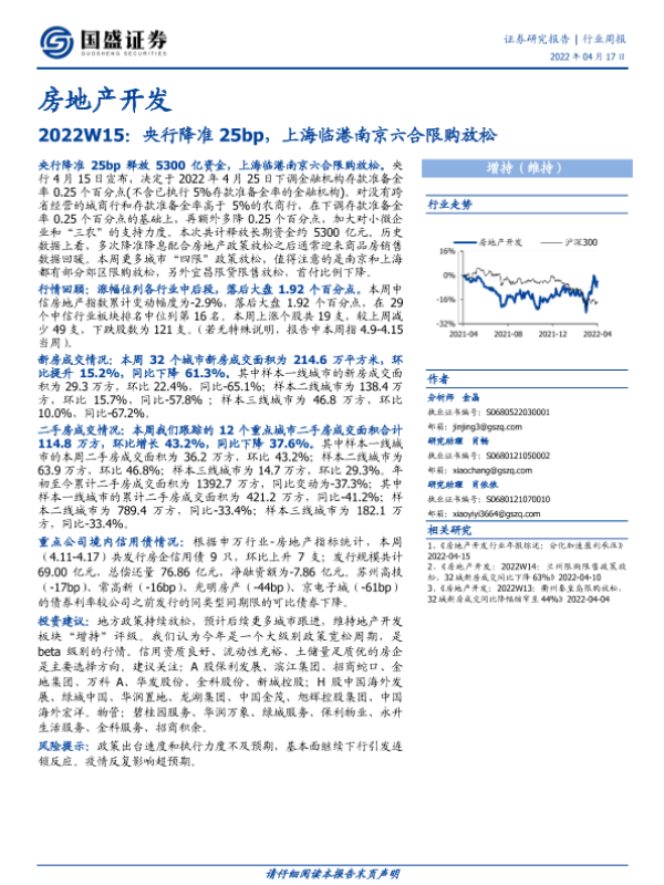 【国盛证券】【20220417】房地产开发行业周报2022W15:央行降准25bp,上海临港南京六合限购放松-18页