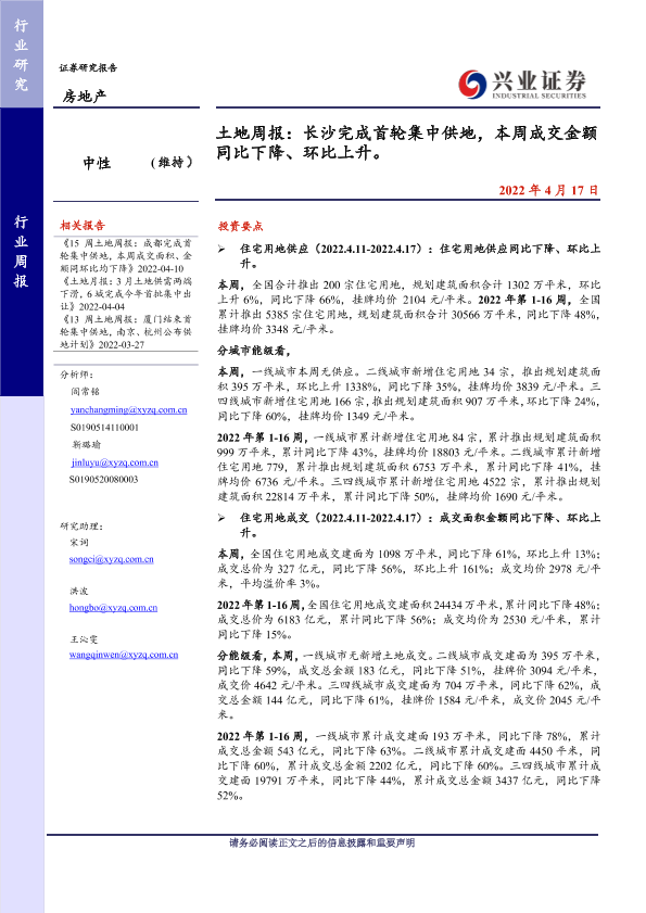 【兴业证券】【20220417】土地周报:长沙完成首轮集中供地,本周成交金额同比下降、环比上升-10页