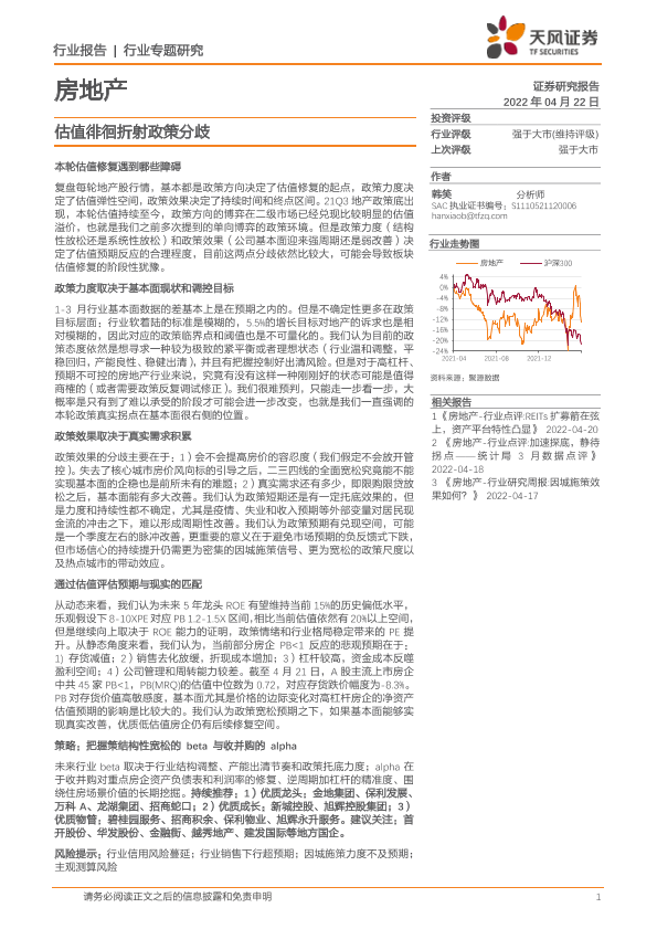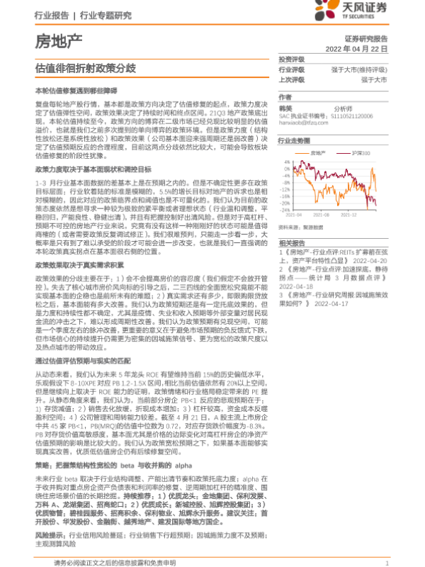 【天风证券】【20220422】房地产行业专题研究:估值徘徊折射政策分歧-12页