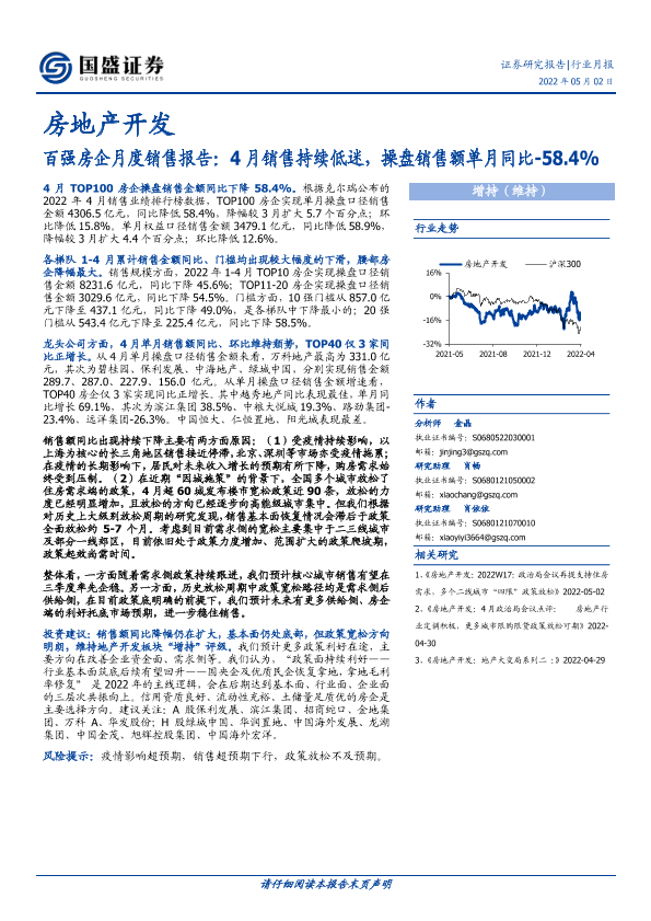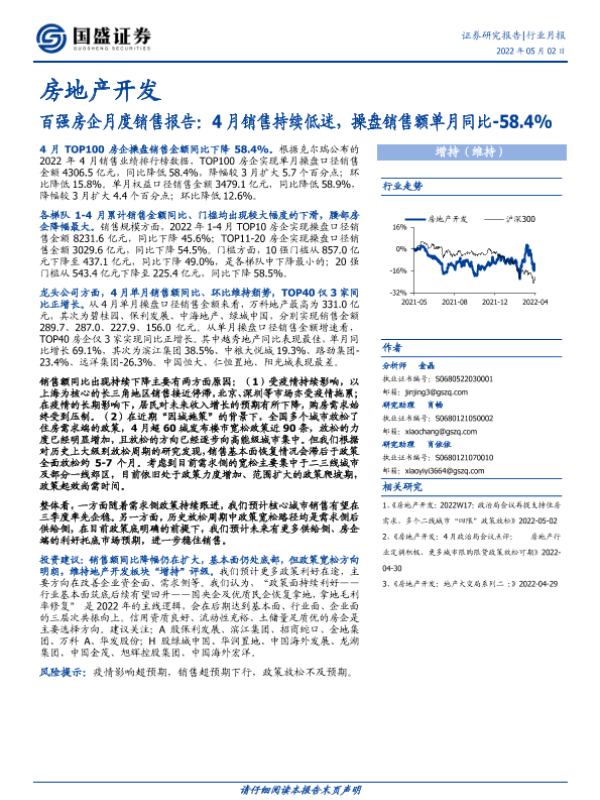 【国盛证券】【20220502】房地产开发百强房企月度销售报告:4月销售持续低迷,操盘销售额单月同比-58.4%-10页