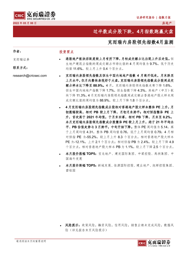 【克而瑞证券】【20220506】克而瑞内房股领先指数4月监测-过半数成分股下跌,4月指数跑赢大盘-11页