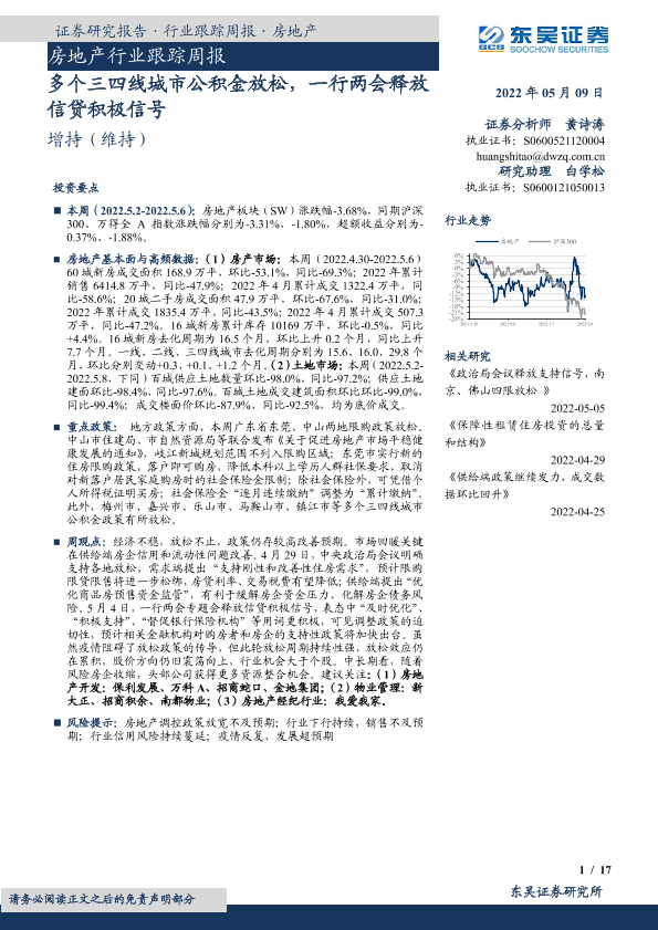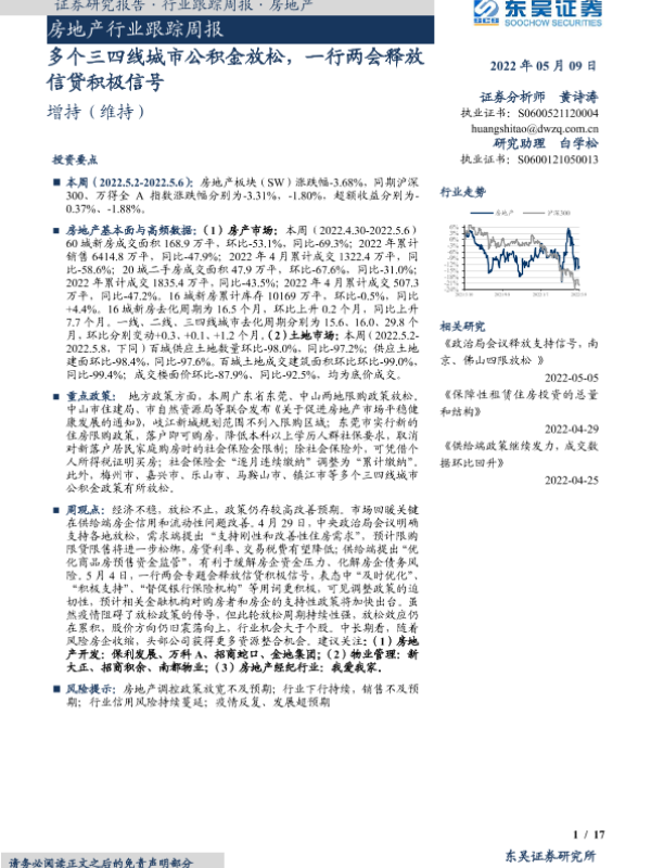 【东吴证券】【20220509】房地产行业跟踪周报:多个三四线城市公积金放松,一行两会释放信贷积极信号-17页