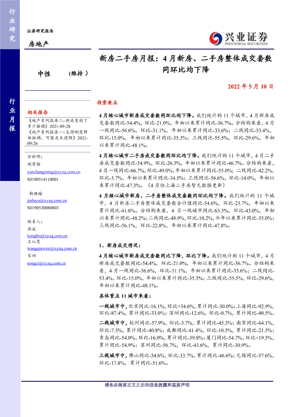 【兴业证券】【20220510】4月新房、二手房整体成交套数同环比均下降-9页