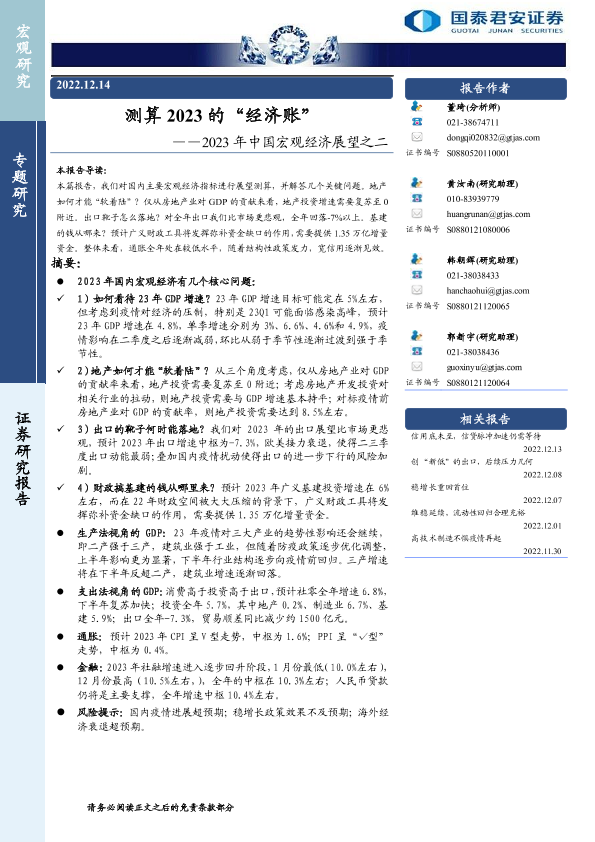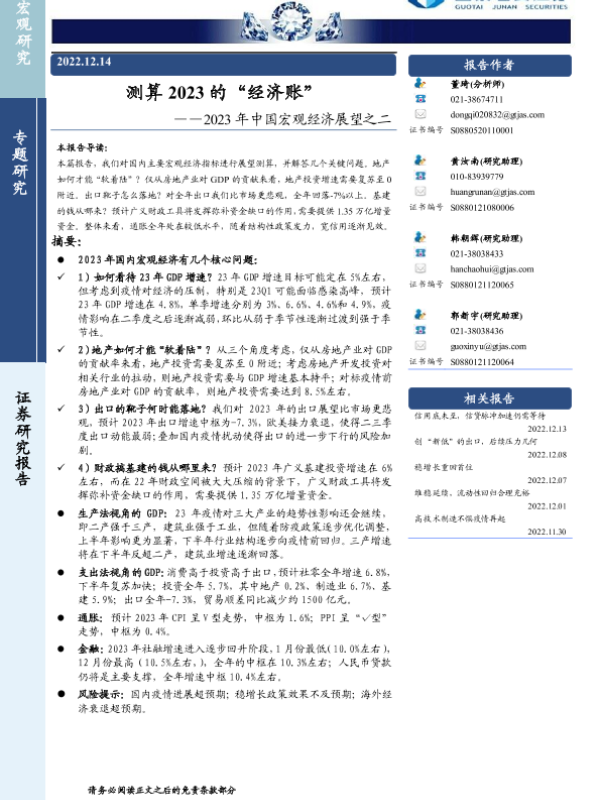 【国泰君安证券】【20221214】2023年中国宏观经济展望之二:测算2023的“经济账”-20页