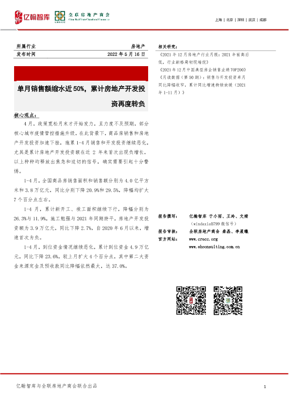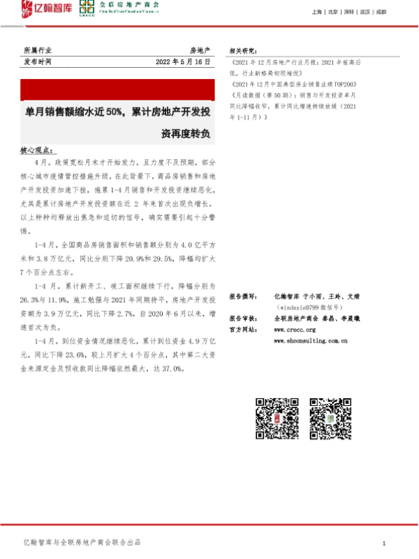 【亿翰智库与全联房地产商会】【20220516】单月销售额缩水近50%,累计房地产开发投资再度转负-10页