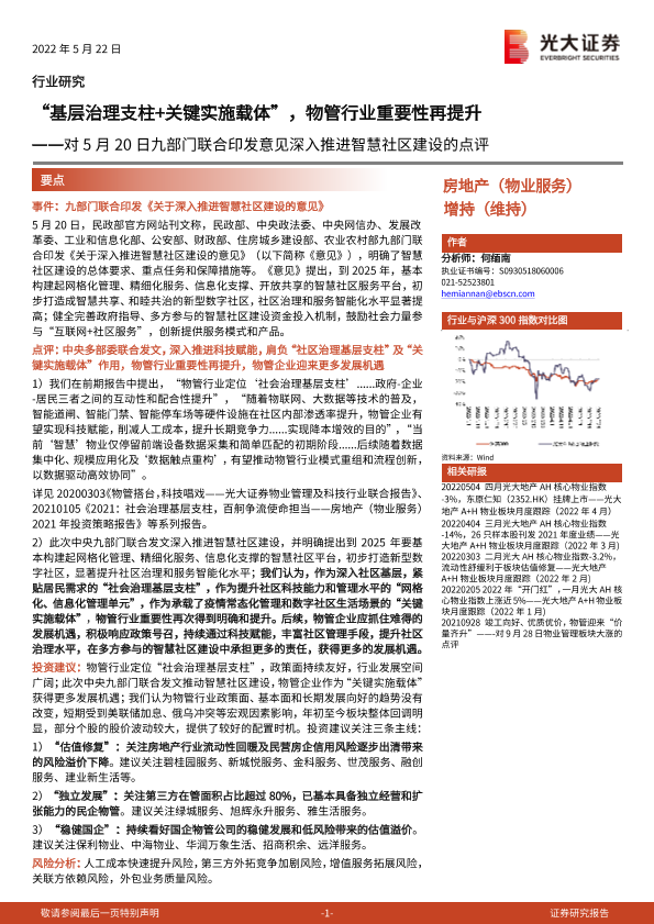 【光大证券】【20220522】物管行业重要性再提升:对九部门联合印发意见深入推进智慧社区建设的点评-2页