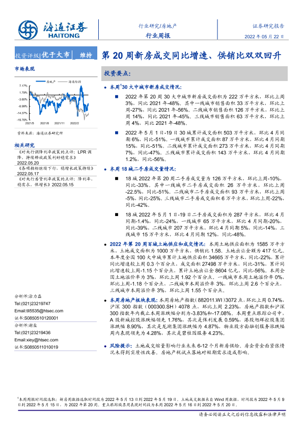 【海通证券】【20220522】第20周新房成交同比增速、供销比双双回升-6页