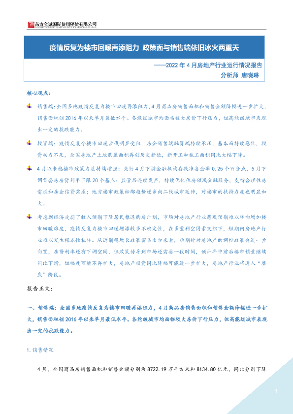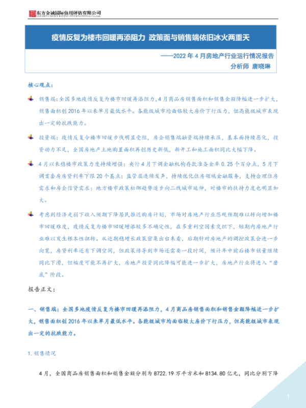 【东方金诚】【20220527】2022年4月房地产行业运行情况报告:疫情反复为楼市回暖再添阻力 政策面与销售端依旧冰火两重天-9页