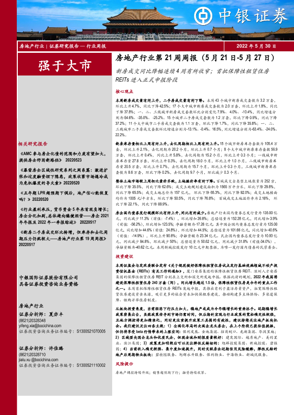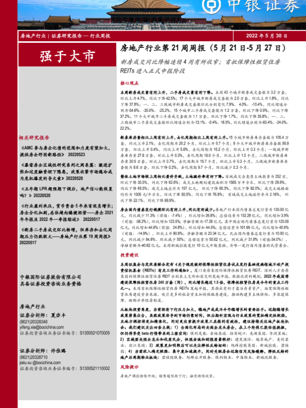 【中银证券】【20220530】房地产行业第21周周报:新房成交同比降幅连续4周有所收窄;首批保障性租赁住房REITs进入正式申报阶段-32页