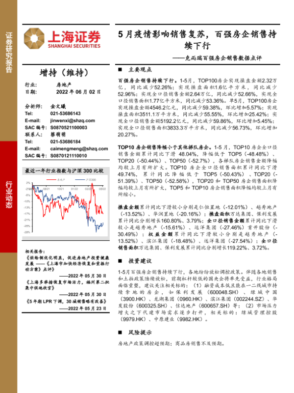 【上海证券】【20220602】5月疫情影响销售复苏,百强房企销售持续下行-12页