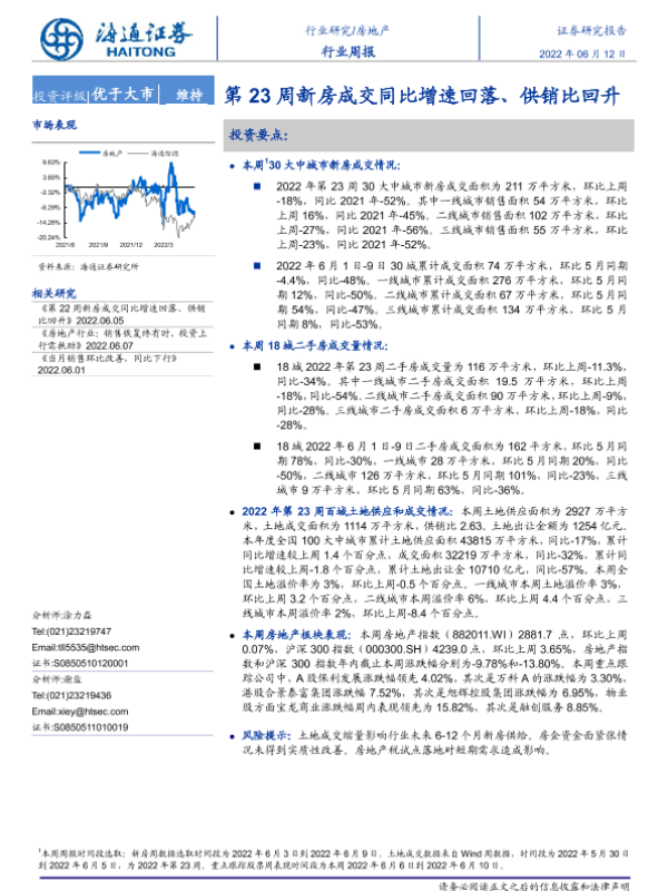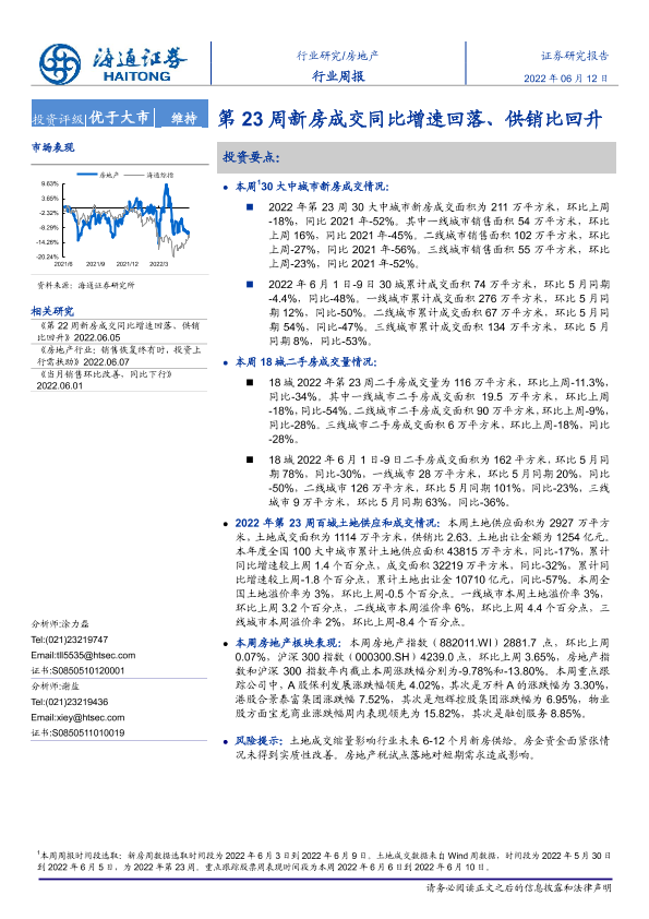 【海通证券】【20220612】第23周新房成交同比增速回落、供销比回升-6页