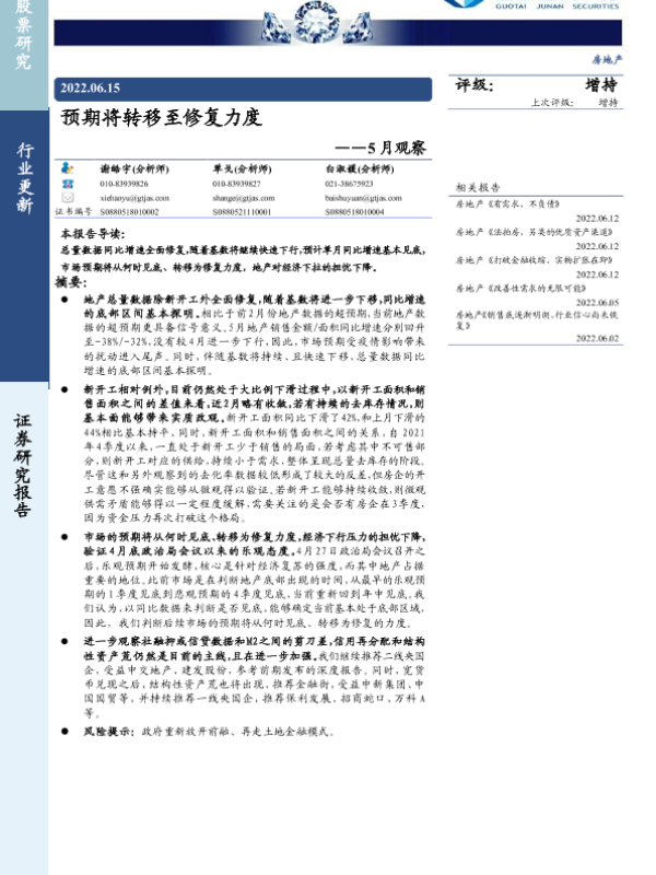 【国泰君安证券】【20220615】房地产行业5月观察:预期将转移至修复力度-3页