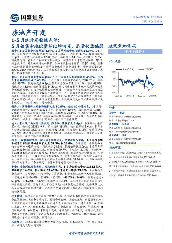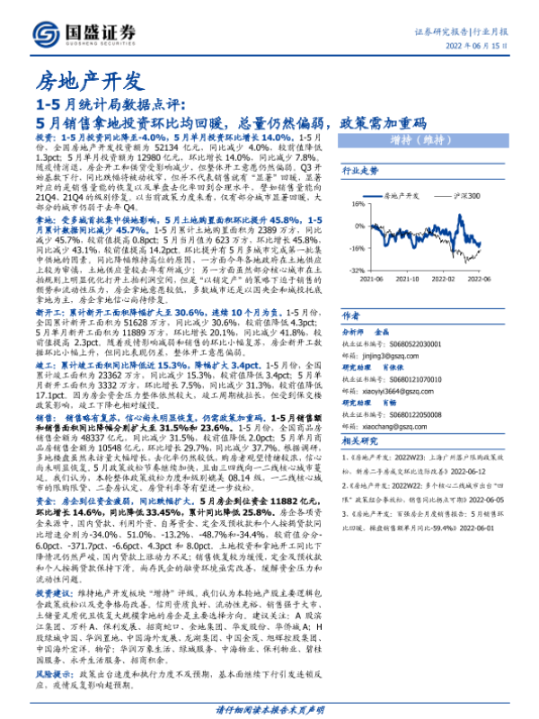 【国盛证券】【20220615】1-5月统计局数据点评:5月销售拿地投资环比均回暖,总量仍然偏弱,政策需加重码-16页