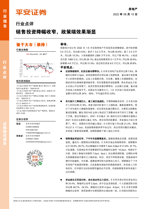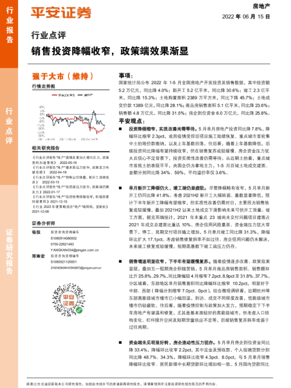 【平安证券】【20220615】房地产行业点评:销售投资降幅收窄,政策端效果渐显-7页