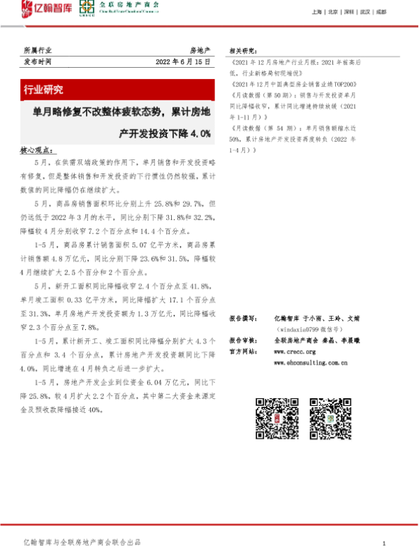 【亿翰智库与全联房地产商会】【20220615】单月略修复不改整体疲软态势,累计房地产开发投资下降4.0%-10页