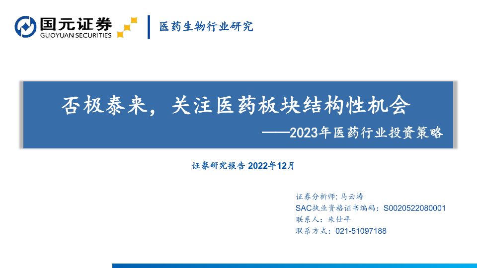 【国元证券】【20221201】2023年医药行业投资策略:否极泰来,关注医药板块结构性机会-85页