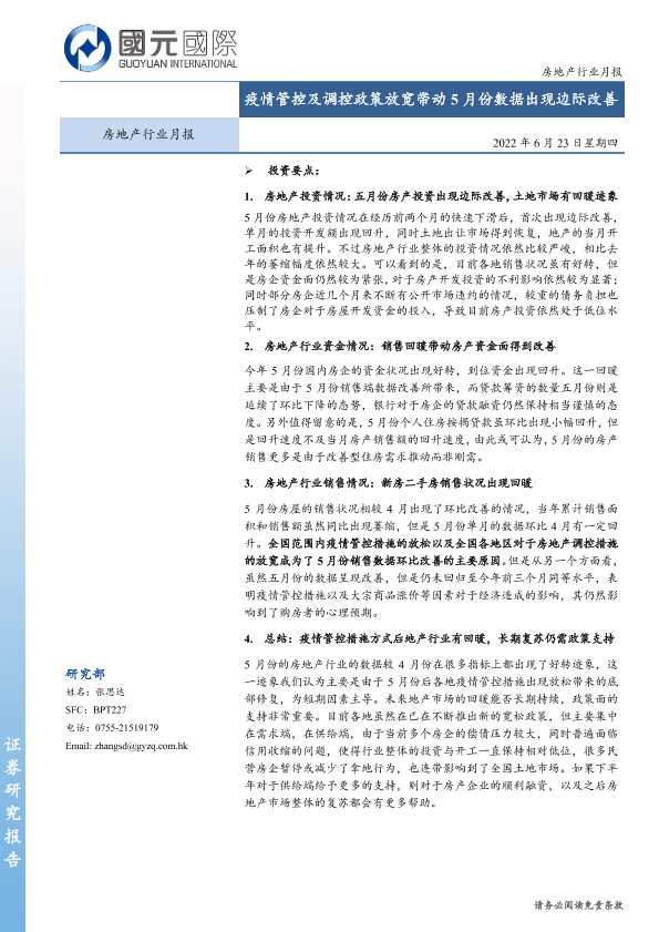 【国元国际】【20220623】房地产行业月报:疫情管控及调控政策放宽带动5月份数据出现边际改善-15页