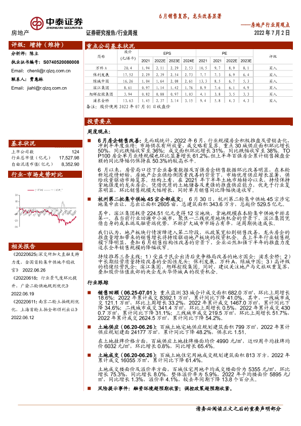 【中泰证券】【20220702】6月销售复苏,龙头改善显著-11页
