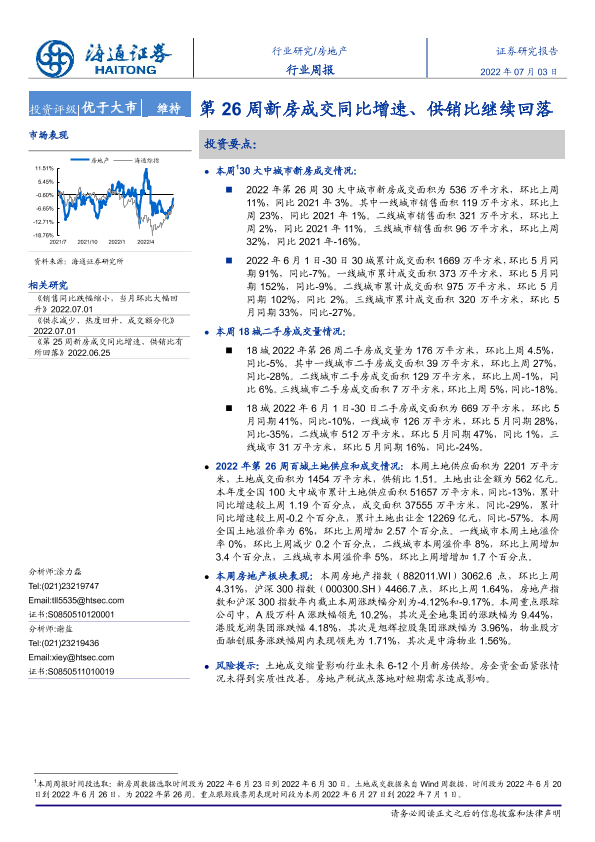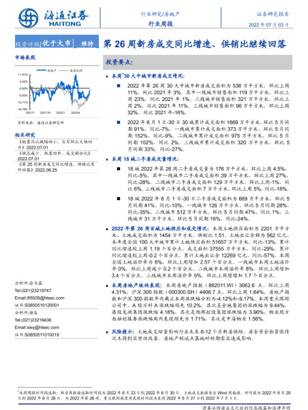 【海通证券】【20220703】第26周新房成交同比增速、供销比继续回落-6页