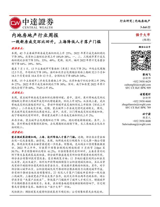【中达证券】【20220703】内地房地产行业周报:一线新房成交环比回升,上海降低人才落户门槛-12页