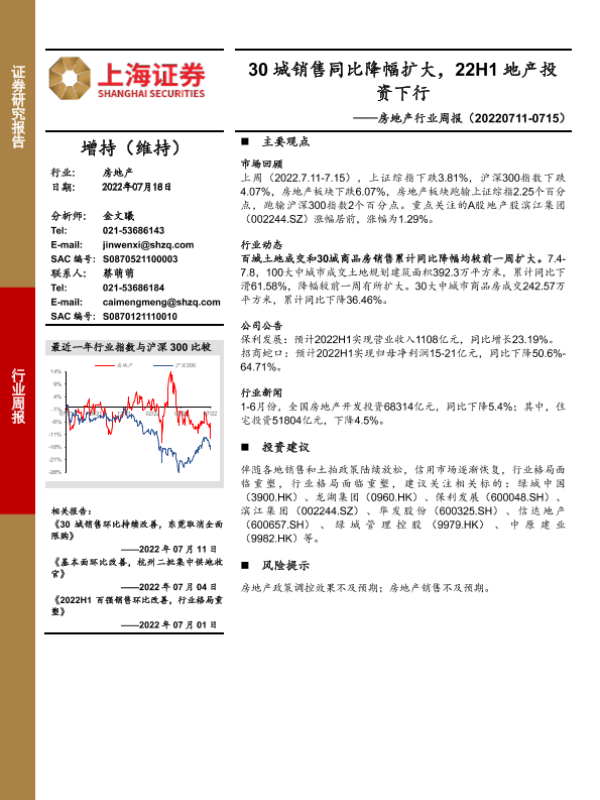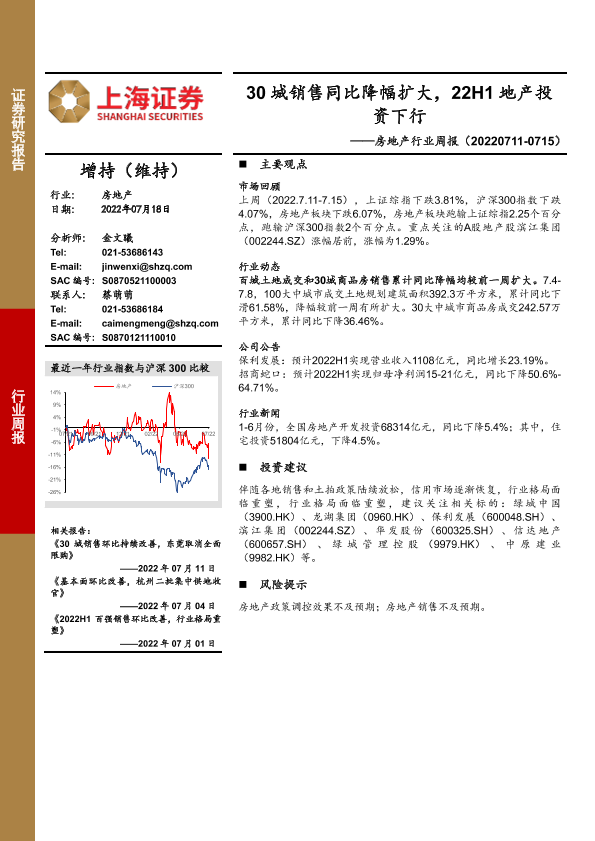 【上海证券】【20220718】30城销售同比降幅扩大,22H1地产投资下行-12页