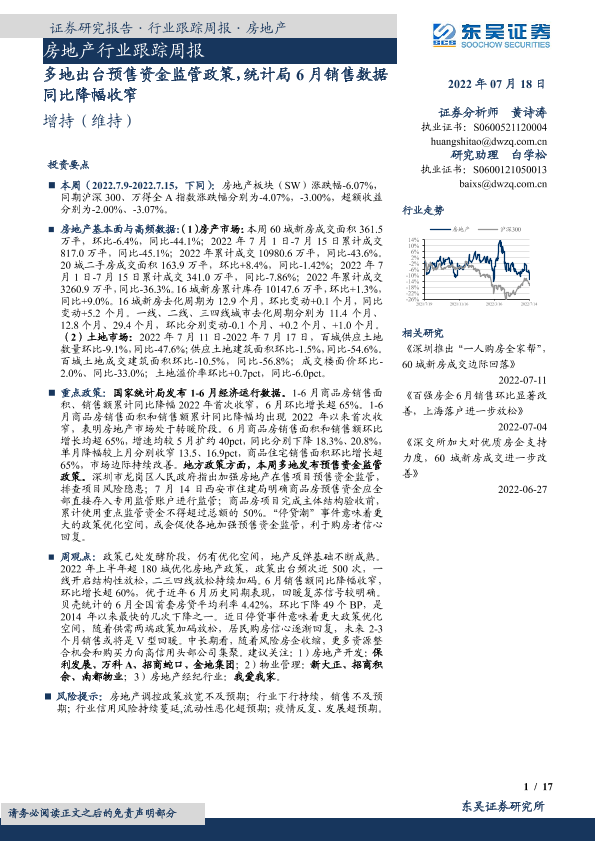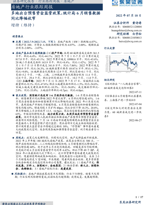 【东吴证券】【20220718】多地出台预售资金监管政策,统计局6月销售数据同比降幅收窄-17页