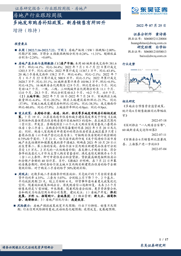 【东吴证券】【20220725】多地发布购房补贴政策,新房销售有所回升-17页