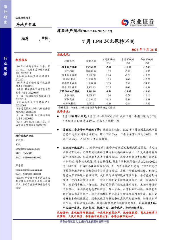 LPR利率 房地产开发商 房贷利率 行业周报 港股地产