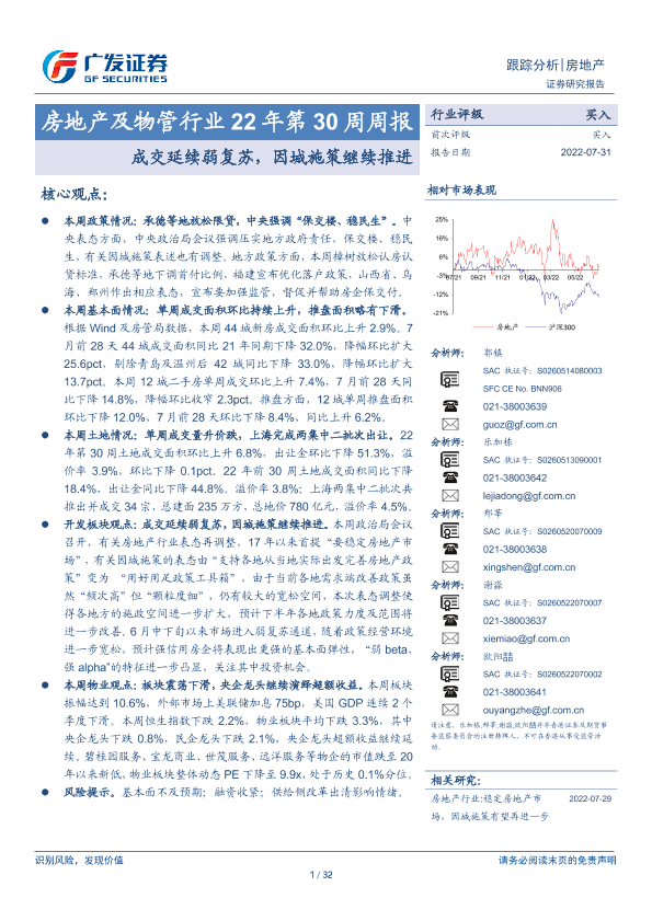 【广发证券】【20220731】房地产及物管行业22年第30周周报:成交延续弱复苏,因城施策继续推进-32页