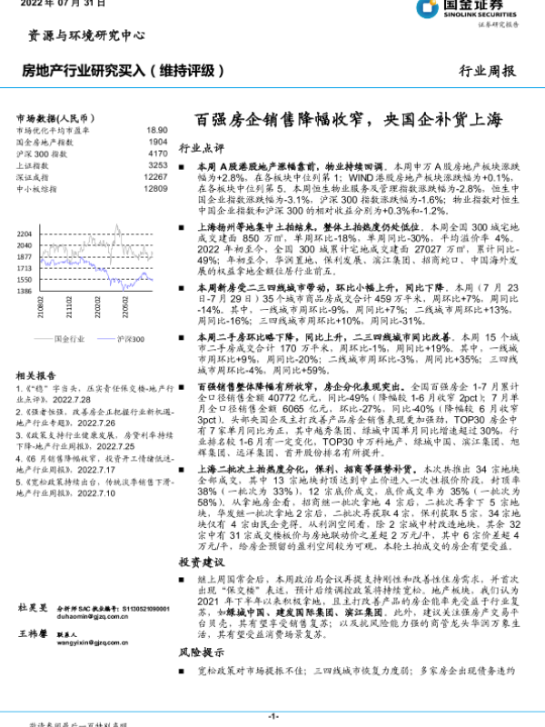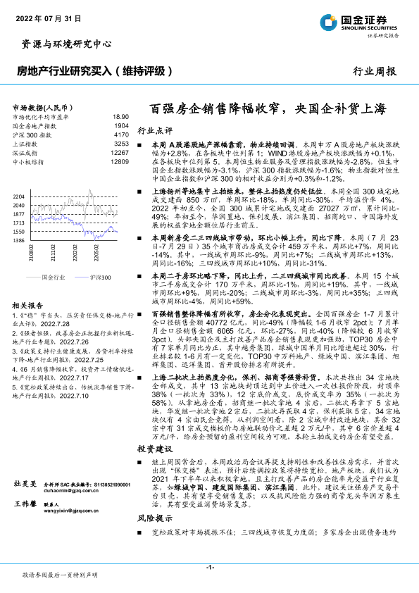 【国金证券】【20220731】房地产行业研究周报:百强房企销售降幅收窄,央国企补货上海-18页