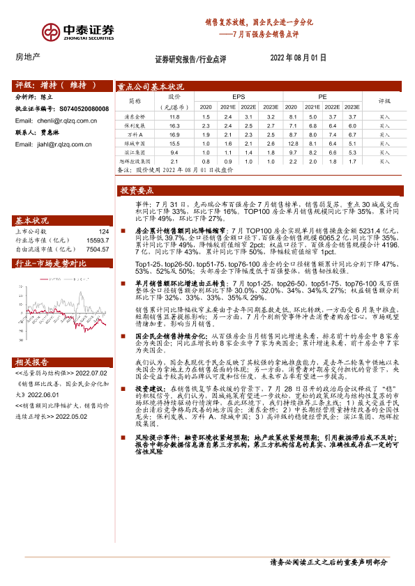 【中泰证券】【20220801】7月百强房企销售点评-销售复苏放缓,国企民企进一步分化-3页
