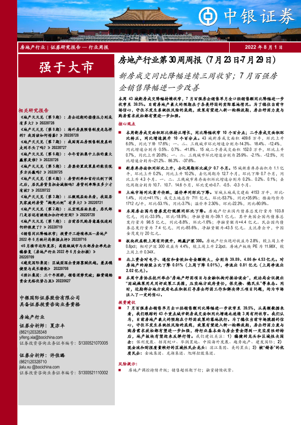 【中银证券】【20220801】房地产行业第30周周报:新房成交同比降幅连续三周收窄;7月百强房企销售降幅进一步改善-30页