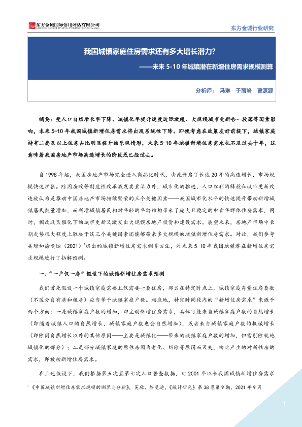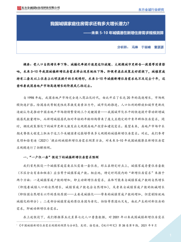 【东方金诚】【20220803】未来5-10年城镇潜在新增住房需求规模测算——我国城镇家庭住房需求还有多大增长潜力?-8页