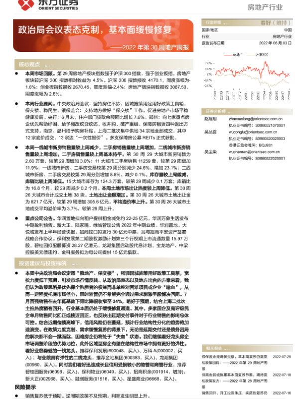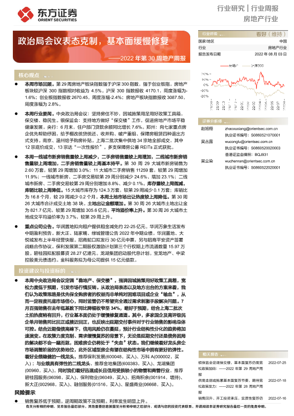 【东方证券】【20220803】2022年第30周地产周报-政治局会议表态克制,基本面缓慢修复-17页