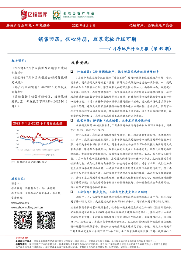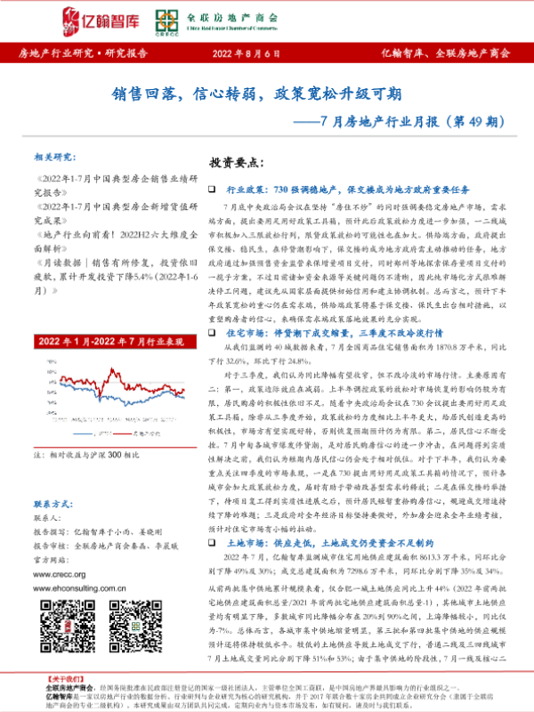 【亿翰智库】【20220806】7月房地产行业月报:销售回落,信心转弱,政策宽松升级可期-32页