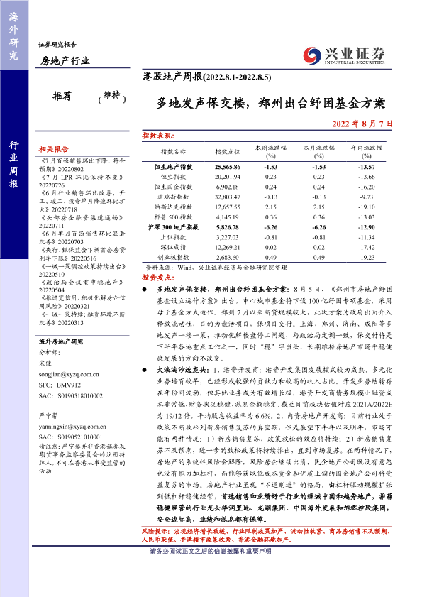 保交楼 市场表现 房地产政策 港股地产 纾困基金