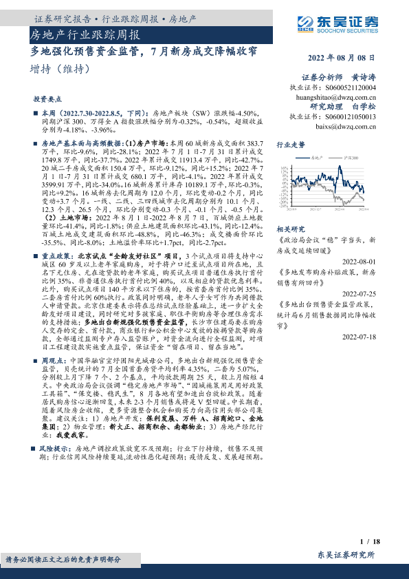【东吴证券】【20220808】房地产行业跟踪周报:多地强化预售资金监管,7月新房成交降幅收窄-18页