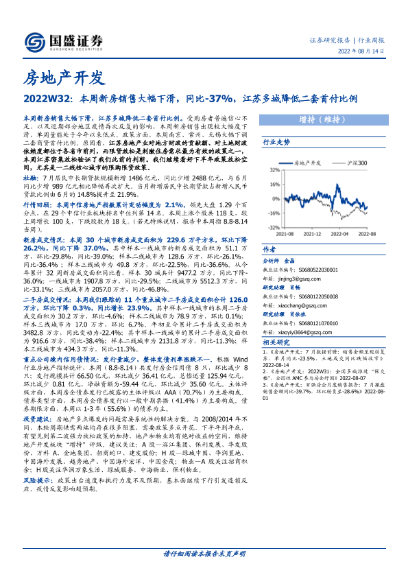 【国盛证券】【20220814】2022W32:本周新房销售大幅下滑,同比-37%,江苏多城降低二套首付比例-14页