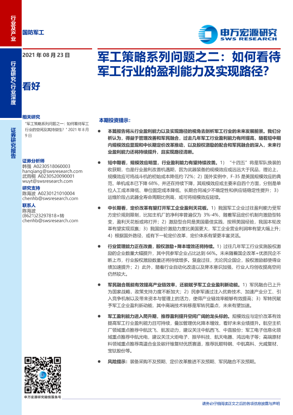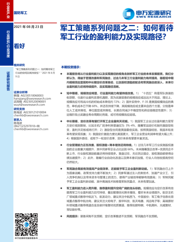 【申万宏源】【20210823】国防军工行业军工策略系列问题之二:如何看待军工行业的盈利能力及实现路径?-45页