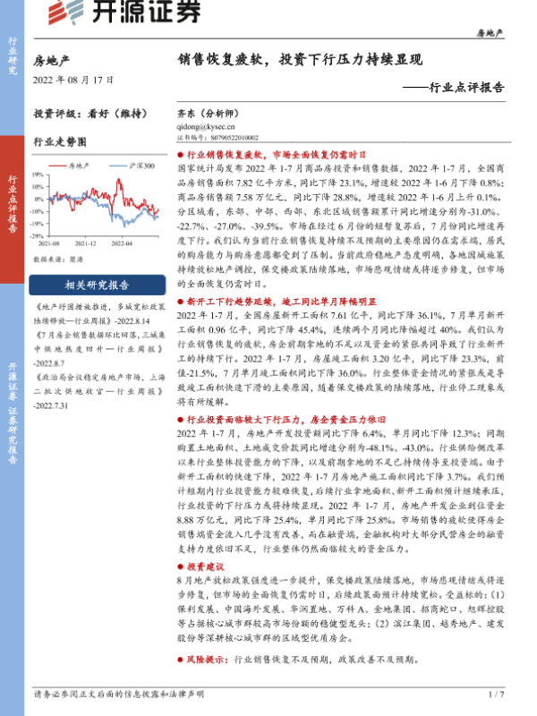 【开源证券】【20220817】销售恢复疲软,投资下行压力持续显现-7页