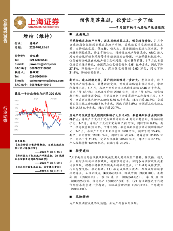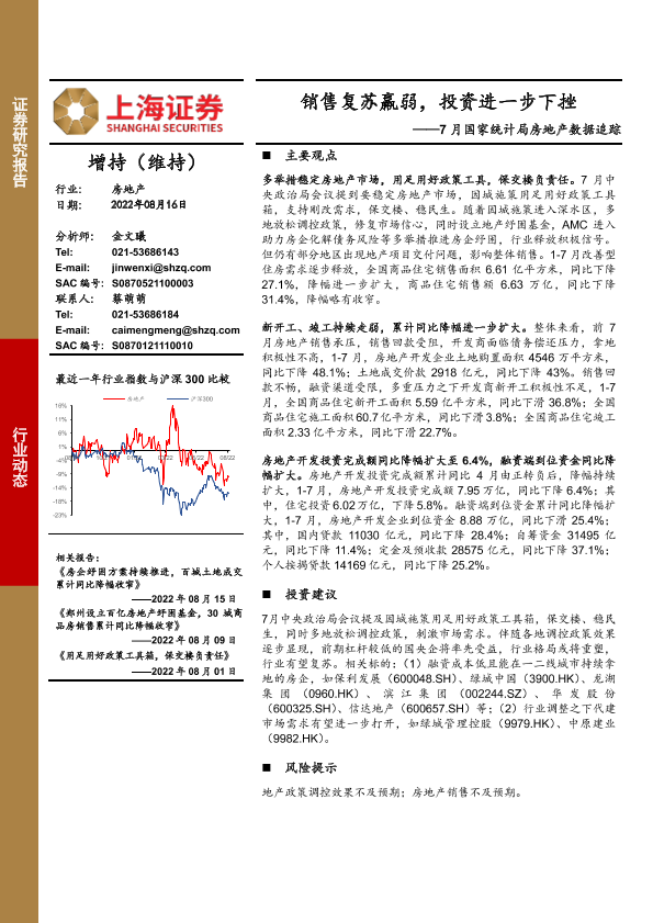 【上海证券】【20220816】7月国家统计局房地产数据追踪:销售复苏羸弱,投资进一步下挫-8页