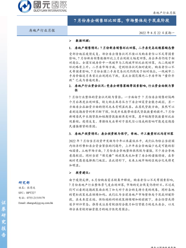 【国元国际】【20220822】房地产行业月报:7月份房企销售环比回落,市场整体处于筑底阶段-18页