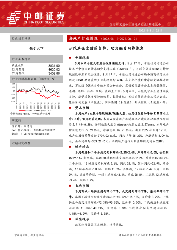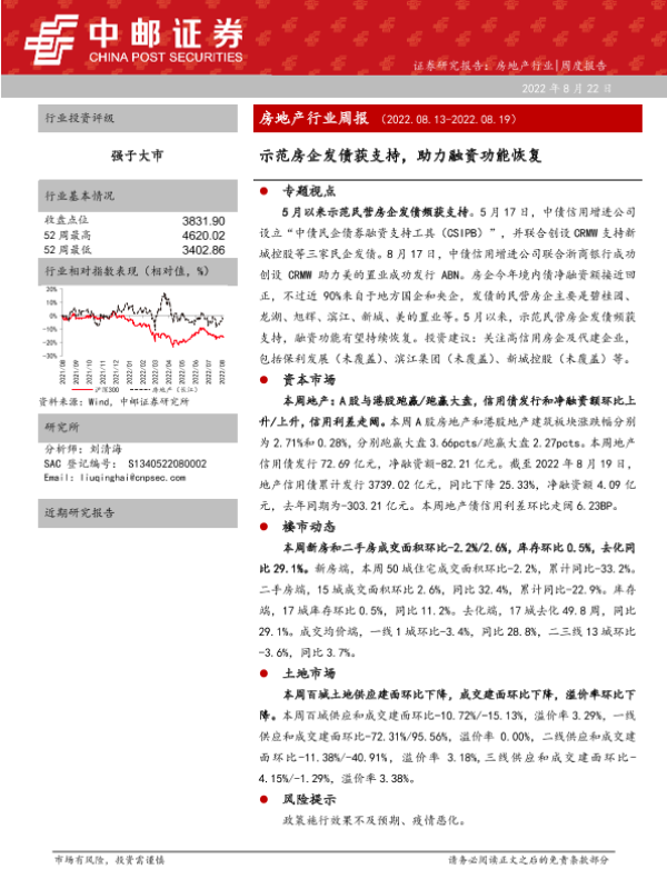 【中邮证券】【20220822】房地产行业周报:示范房企发债获支持,助力融资功能恢复-36页