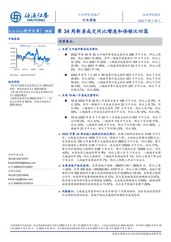 【海通证券】【20220828】房地产行业周报:第34周新房成交同比增速和供销比回落-6页