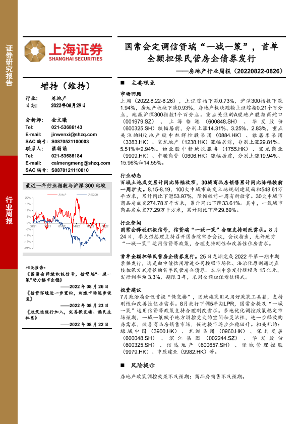 【上海证券】【20220829】房地产行业周报:国常会定调信贷端“一城一策”,首单全额担保民营房企债券发行-12页