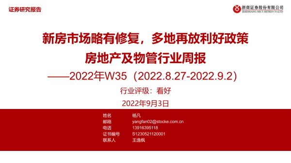 【浙商证券】【20220903】房地产及物管行业周报2022年W35:新房市场略有修复,多地再放利好政策-27页