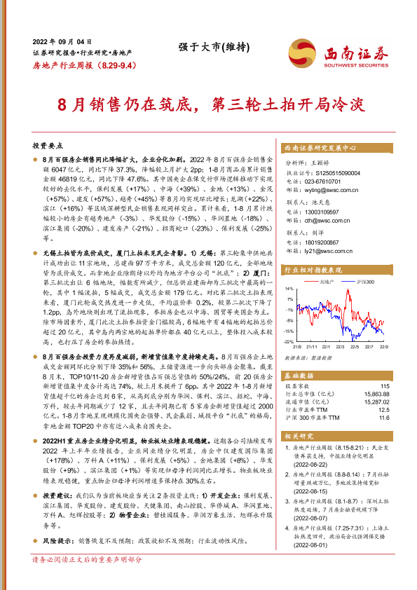 【西南证券】【20220904】房地产行业周报:8月销售仍在筑底,第三轮土拍开局冷淡-17页